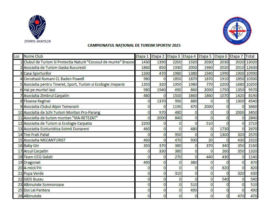 Clasamentul general al Campionatului Național de Turism Sportiv ”ȘTAFETA MUNȚILOR - FRTS” 2025